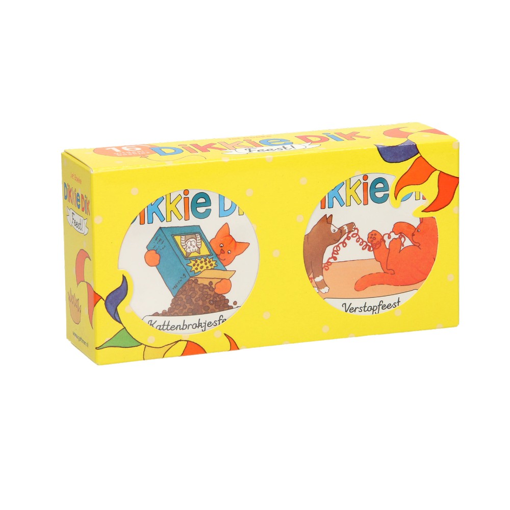 Uitdeelboekjes van dik karton met avonturen van Dikkie Dik. Er zijn 4 titels: Verstopfeest, Kattenbrokjesfeest, Modderfeest, Muizenfeest.